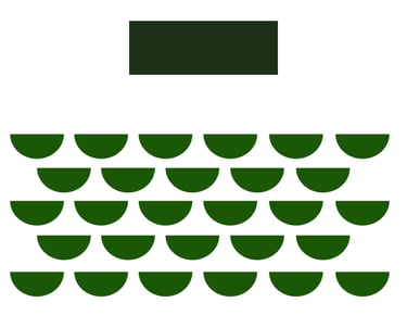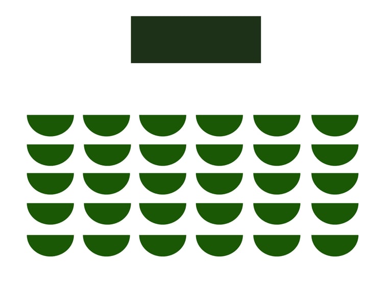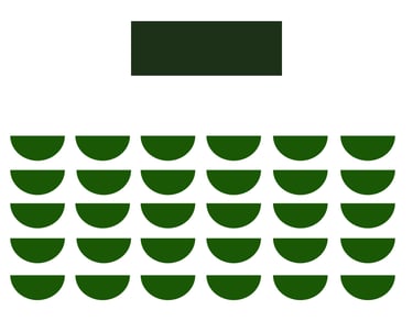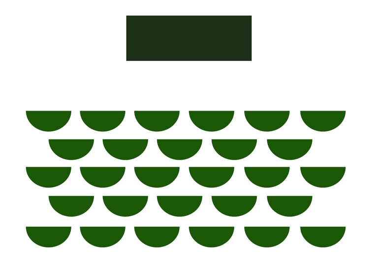 Stuhlreihen ohne Tische hintereinander versetzt mit Blick zur Bühne oder Leinwand bzw. zum Moderatoren