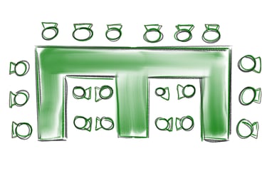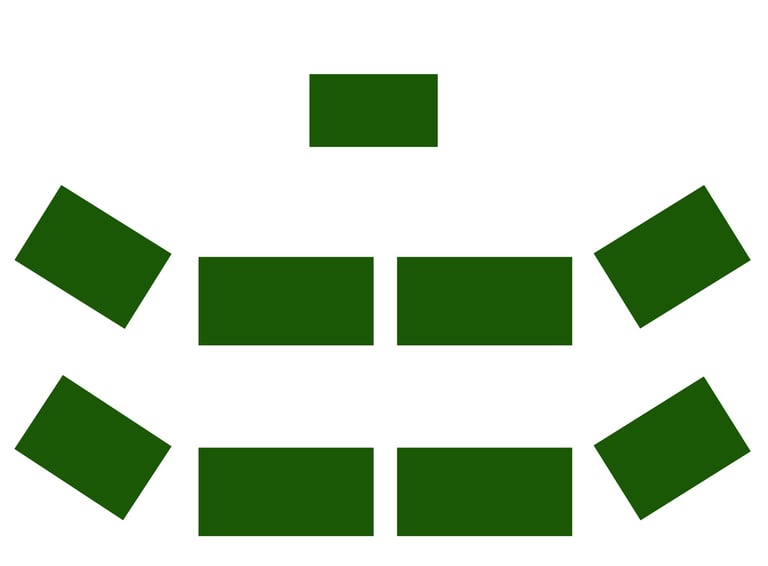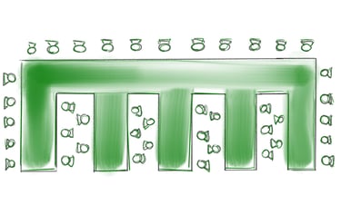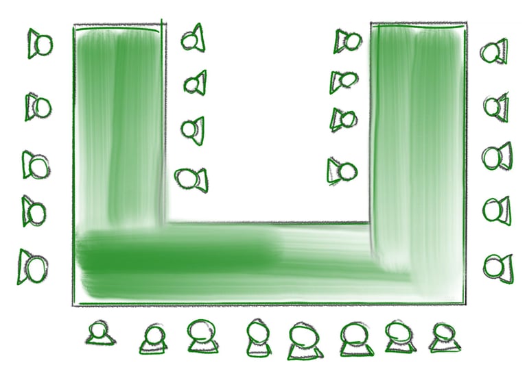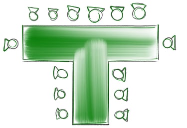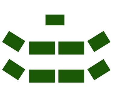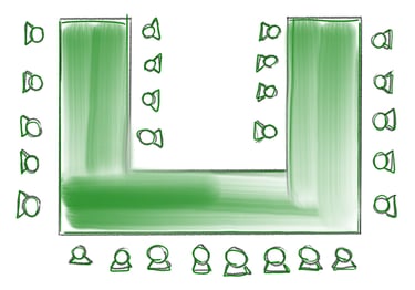 wie bei der geraden Bestuhlung, jedoch haben hier die Teilnehmer am Rand einen besseren Blick nach vorne. Diese Form ist bei einer größeren Personenanzahl als bei der geraden Bestuhlung zu stellen