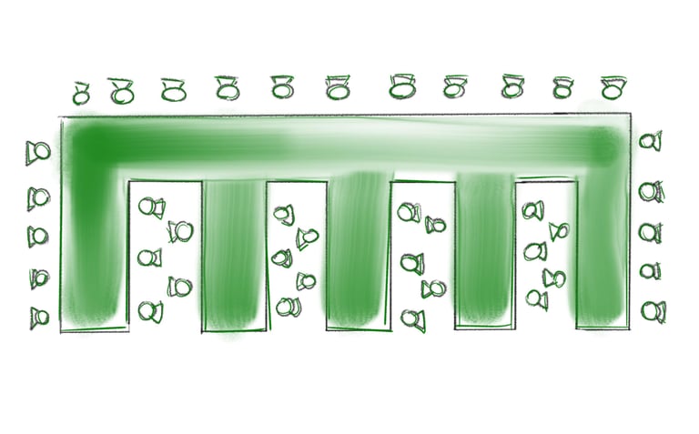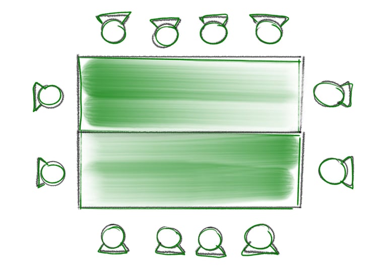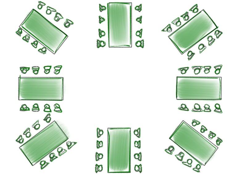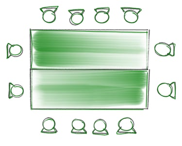 zwei Tischreihen aneinander gestellt